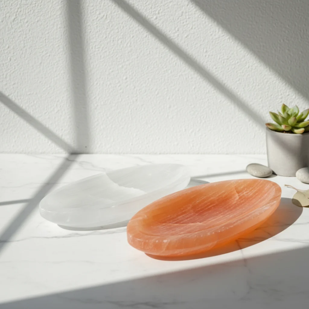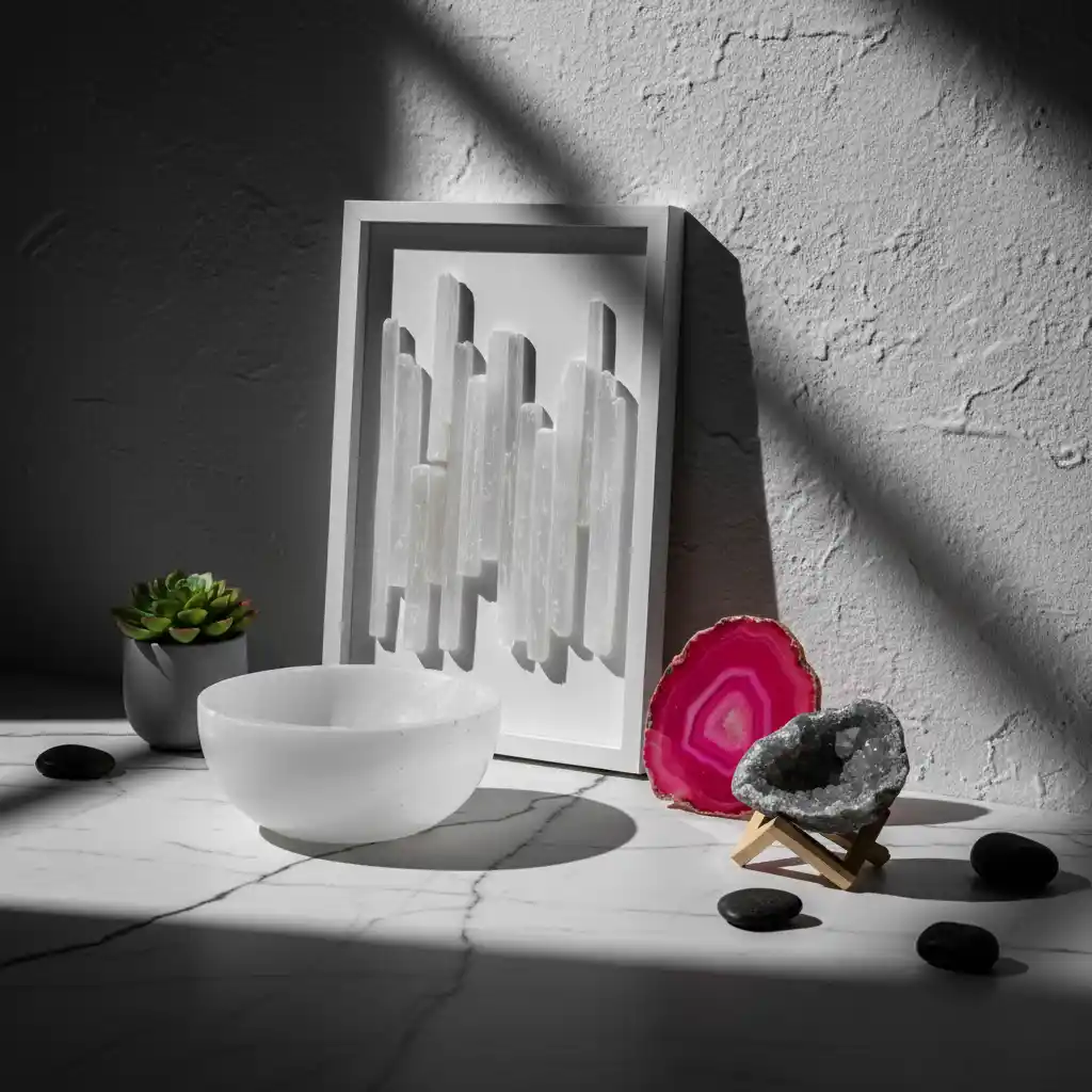 L'alliance parfaite entre luxe minimaliste et spiritualité. Sublimez votre décoration avec des créations uniques en sélénite et agate.